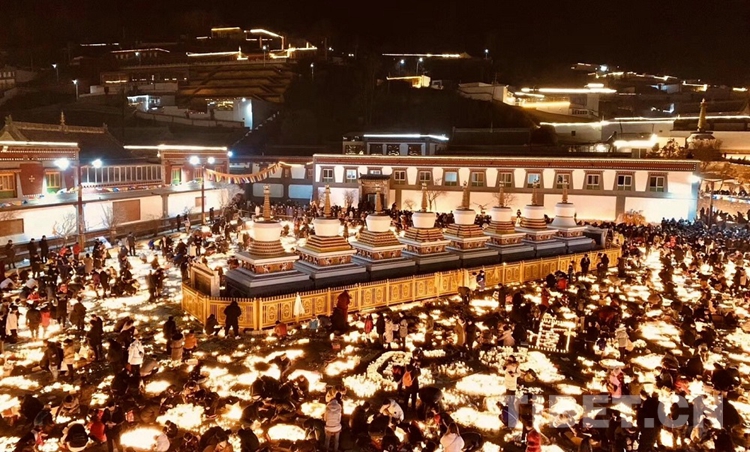 在拉薩沒有看到期待中燃燈節(jié)燈火通明的盛況,但是朋友發(fā)來了宗喀巴故鄉(xiāng)青海湟中塔爾寺的燃燈節(jié)照片,人們在廣場上用酥油燈擺成六字真言、蓮師密咒、法輪和各種吉祥圖案……