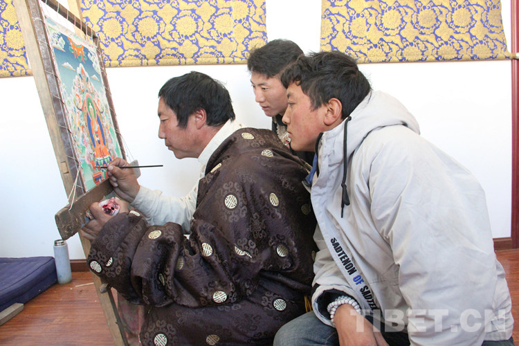 圖為曲扎的學(xué)徒在繪制唐卡 攝影:李元梅
