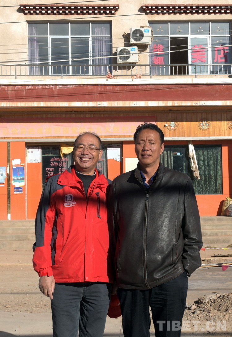 這是唐召明(左)與那曲市副市長(zhǎng)扎南(右)在雙湖縣城合影留念(唐召明提供,2019年9月20日攝)