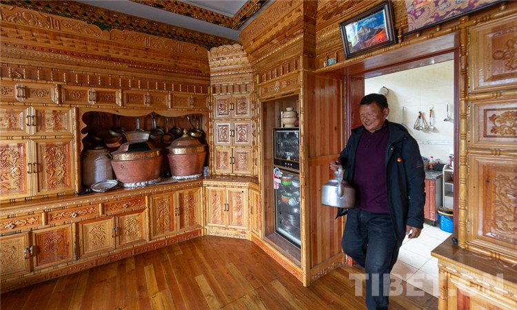 來(lái)到村民仁青家里,仁青正在煤氣灶上燒水?!捌綍r(shí)自己在工地上開裝載機(jī),現(xiàn)在家庭年收入10多萬(wàn)元?!闭勂瓞F(xiàn)在的生活仁青開興地說,以前只有過年才可能吃到的大米,現(xiàn)在已經(jīng)是每家每戶的家庭便飯。