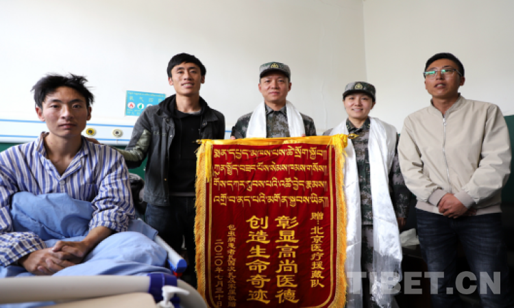 圖為一患者家屬給北京醫(yī)療援藏隊(duì)獻(xiàn)錦旗表示感激 攝影:賈華加