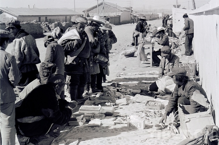 這是在青藏公路進(jìn)藏第一站的安多縣城,內(nèi)地“候鳥”型新客人擺地?cái)偸圪u小商品(唐召明1987年攝)
