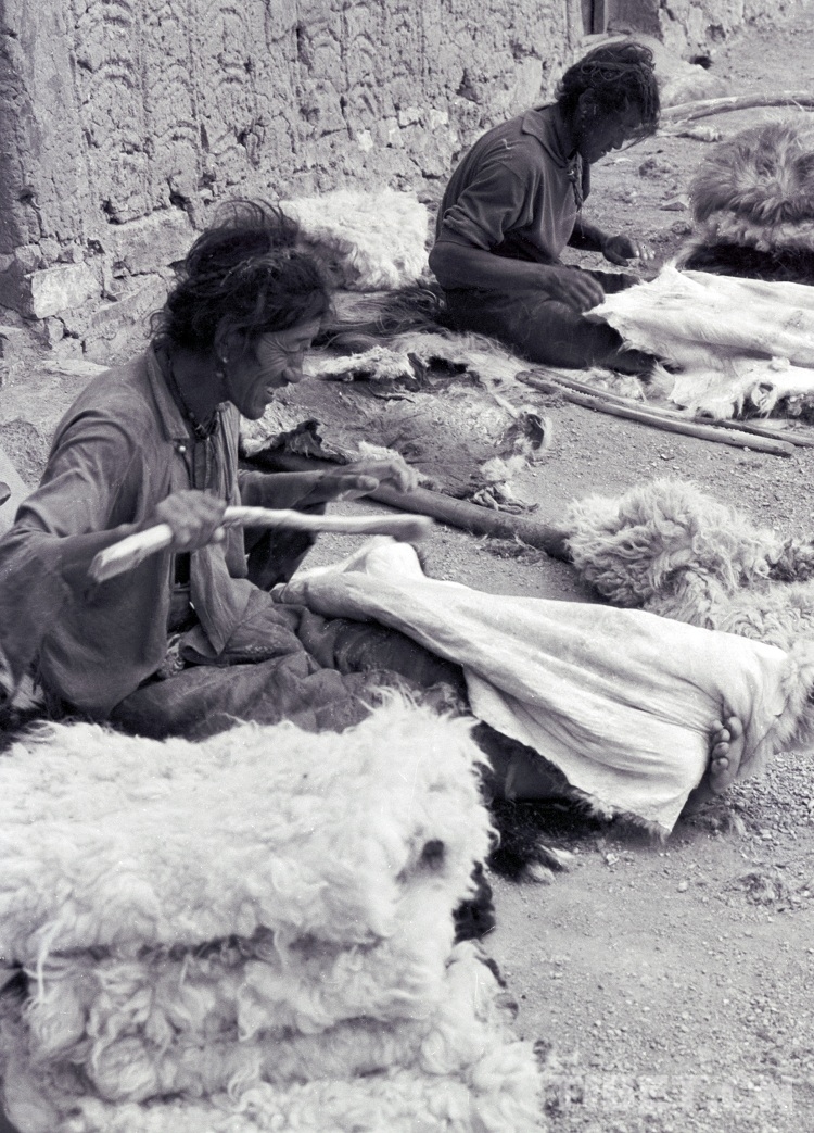 這是西藏南木林縣的藏族農(nóng)民“候鳥”型打工族,在雙湖特別區(qū)(現(xiàn)改為雙湖縣)嘎措鄉(xiāng)為牧民人家揉皮子(唐召明2001年攝)