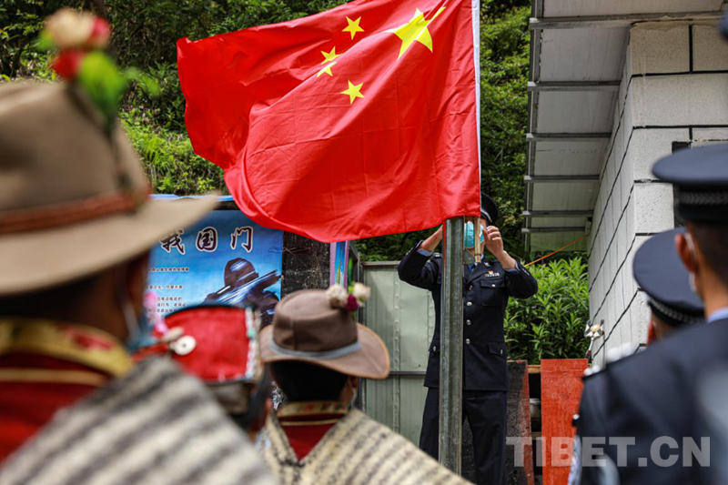 圖為陳塘邊境派出所民警和夏爾巴群眾一同升國(guó)旗