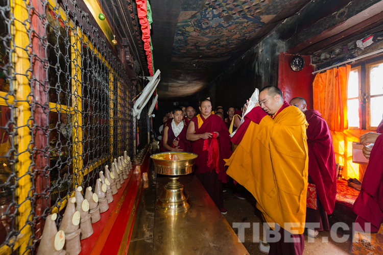 9月16日上午,按照宗教儀軌,十一世班禪在手持香爐高僧和吹嗩吶僧人的引領(lǐng)下,先后朝拜了釋頌南捷靈塔殿、強巴佛殿等主要佛殿并誦經(jīng)祈禱。
