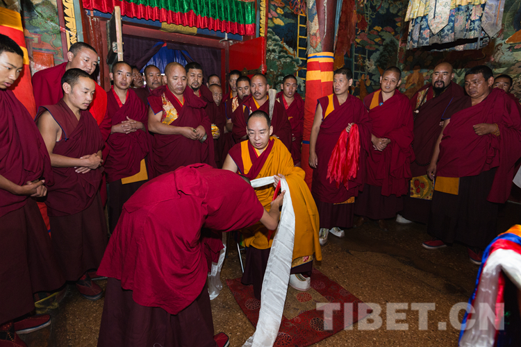 下午,在拉讓日光殿內(nèi),十一世班禪登上寶座接受扎什倫布寺僧眾的朝拜,為他們摸頂賜福,并帶領(lǐng)僧眾誦經(jīng)祈禱,渾厚的誦經(jīng)聲響徹殿內(nèi)。