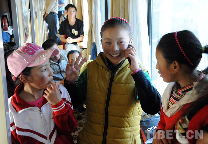 這是乘火車進(jìn)京治療先心病的患兒卓嘎,在火車將抵達(dá)北京時(shí),給阿爸打電話報(bào)平安(唐召明2012年9月18日攝)