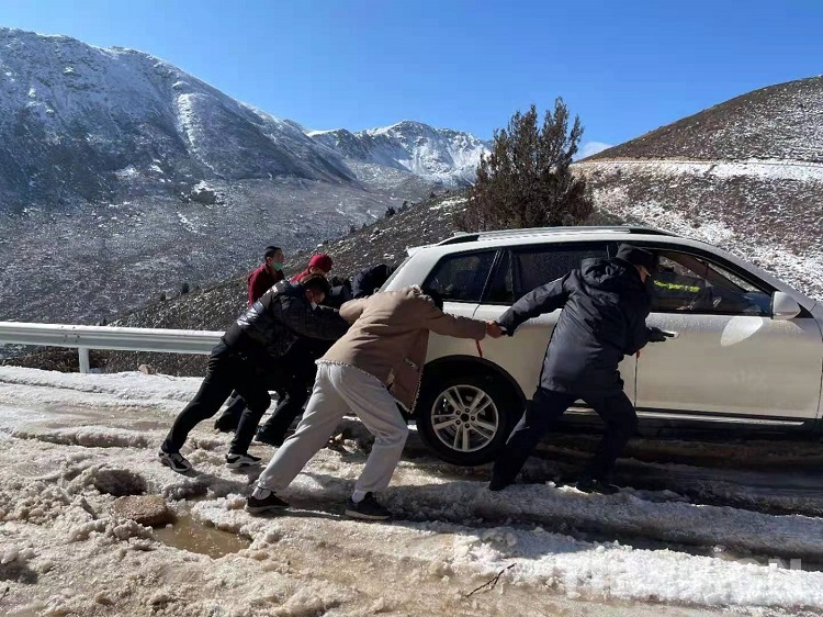 面對焦急萬分的父親,為了讓病中的孩子第一時間得到醫(yī)治,根秋降澤立即下車施救。由于鄉(xiāng)村道路路況較差,加之冰雪覆蓋,車輛打滑嚴重,施救過程十分艱難。根秋降澤憑借多年應對冰雪路況的駕駛經驗,組織大家在極度嚴寒、工具缺乏的情況下,通過刨冰除雪、手推車拉的方式,經過半個多小時的努力終于讓被困車輛擺脫困境。根秋降澤捂著凍僵的手,一再提醒駕駛員要常備防滑鏈條,在冰雪路段需小心謹慎駕駛,切勿急打方向等注意事項。