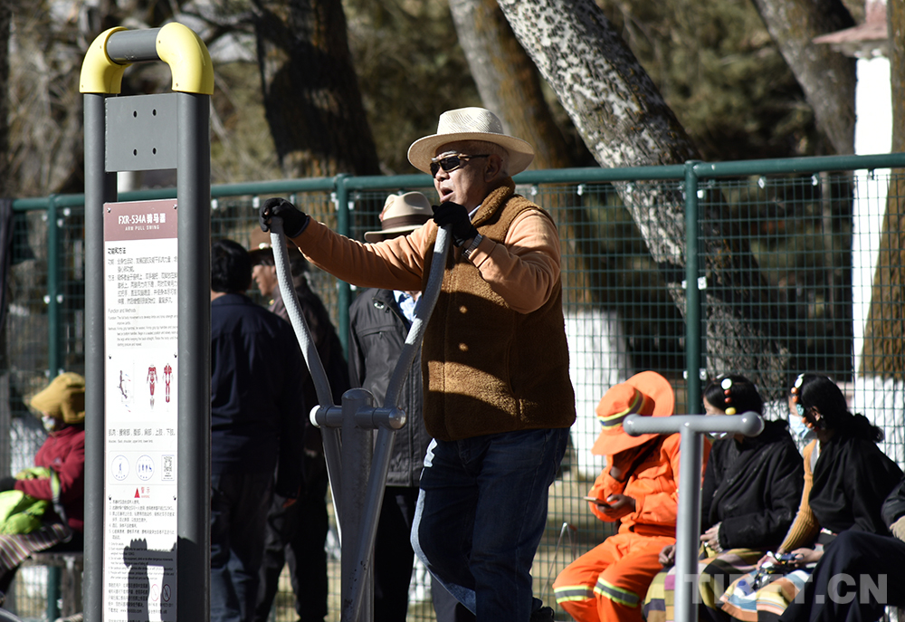 中國西藏網(wǎng)訊 “一二三四五六七八……”戴著便攜式擴音器,一位老大爺照常在宗角祿康公園健身場帶領大家健身鍛煉。