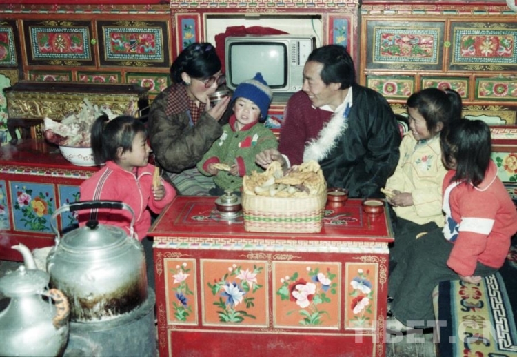 圖為藏北那曲鎮(zhèn)托美朗加一家人在喝酥油茶、吃油炸果,其樂融融 唐召明1989年攝