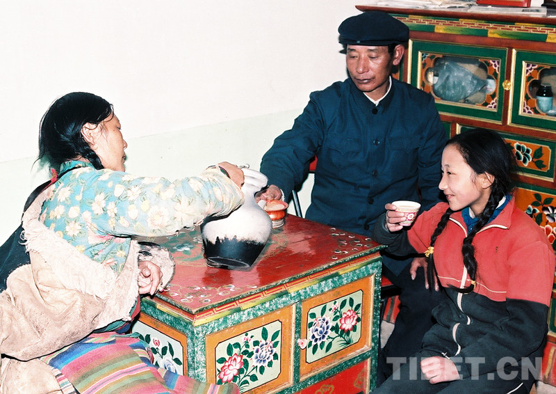 這是公覺扎朗與妻子央金和上小學(xué)的女兒玉珍在文部辦事處(現(xiàn)改為尼瑪縣)家中喝酥油茶,其樂融融(唐召明1989年攝)