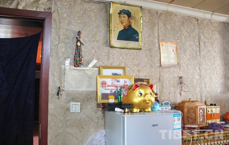 這幅毛主席像,鑲嵌在金色的金屬相框中,畫面是1935年毛主席在陜北身著軍裝的半身像,畫面下方標(biāo)注著紅色的藏文。