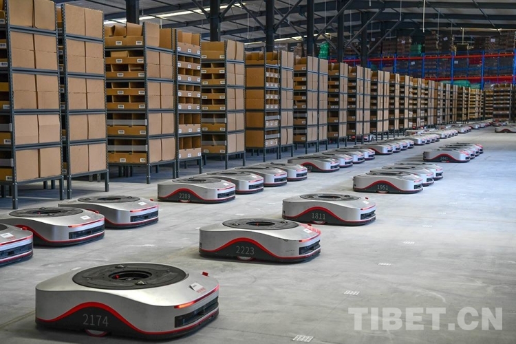 圖為西藏自治區(qū)級公共物流倉儲配送中心里,搬運型機器人“地狼”投用