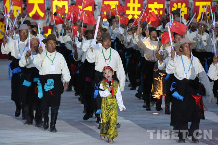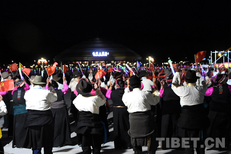 珠峰文創(chuàng)園區(qū)的聯(lián)歡活動(dòng)分為三個(gè)章節(jié),以《在燦爛的陽(yáng)光下》《各族人民感恩黨》《西藏人民齊歡唱》三首歌曲作為開篇樂,來(lái)自日喀則各族各界的演員們,身著日喀則特色節(jié)日盛裝,在廣場(chǎng)中央,擺出數(shù)字“100”的造型,跳起歡快的鍋莊舞,在燈光的輝映下,造型美輪美奐。