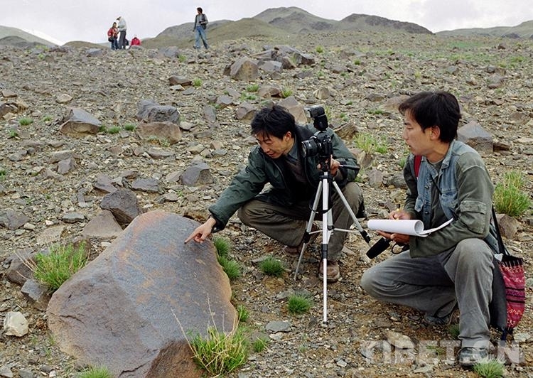 這是藏北無人區(qū)科考團科考人員在對尼瑪縣榮瑪鄉(xiāng)加林山巖畫進行科學考察(唐召明2001年攝)