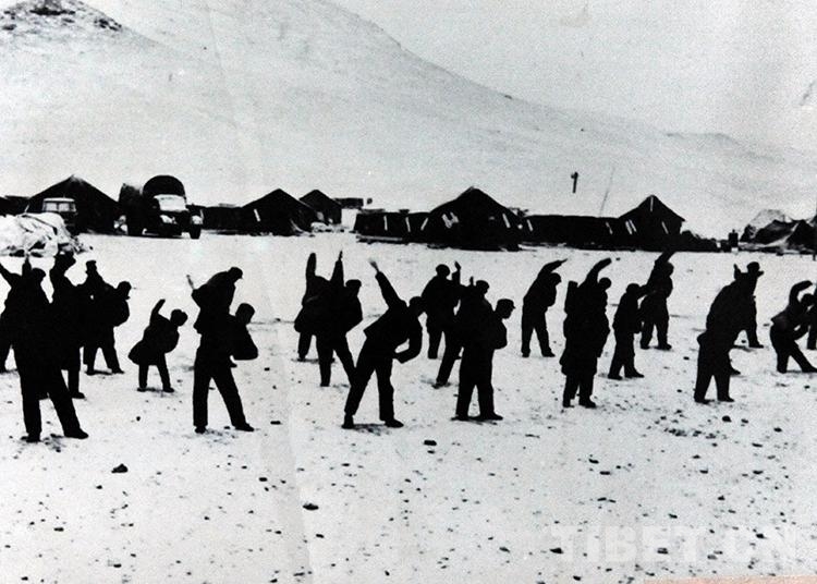 1976年,開發(fā)藏北無人區(qū)的雙湖辦事處(現(xiàn)雙湖縣)拓荒者在駐地做廣播體操(唐召明翻拍照片)