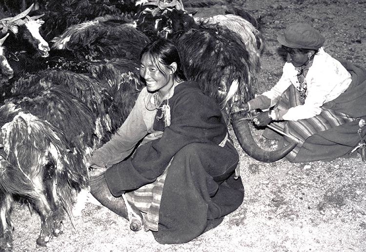 這是在雙湖辦事處北措折鄉(xiāng)(現(xiàn)雙湖縣措折強瑪鄉(xiāng))牧女正在使用牦牛角當器皿擠羊奶(唐召明1989年攝)