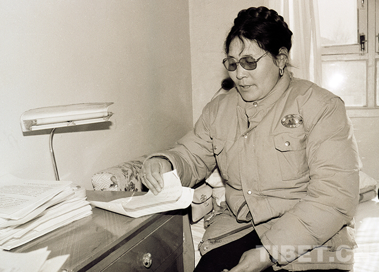 1987年,時(shí)任那曲地區(qū)(現(xiàn)那曲市)行署副專員的次仁玉珍在拉薩參加西藏“兩會(huì)”時(shí),在駐地房間準(zhǔn)備上會(huì)提案(唐召明1987年攝)