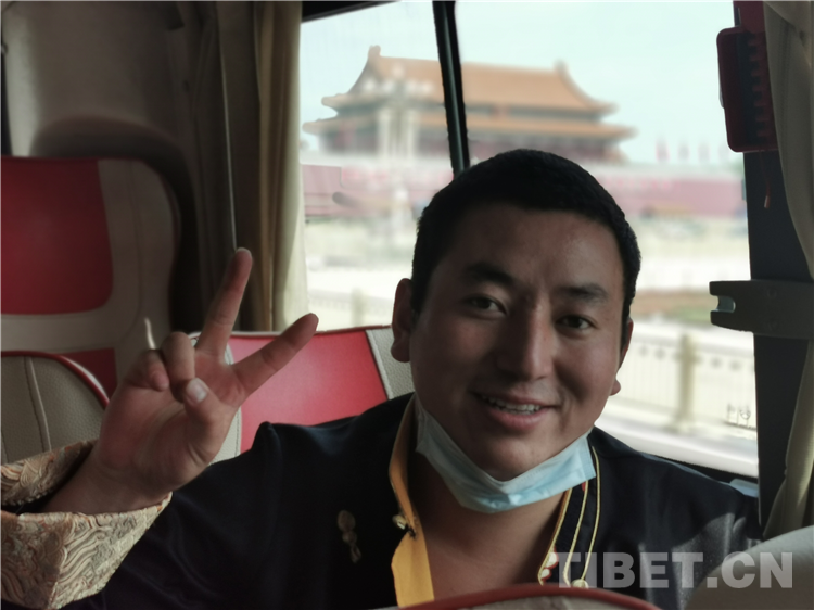 圖為因?yàn)橐咔榉揽匾?,不能安排下車拍照留影,這位患者很高興在車上與天安門合影