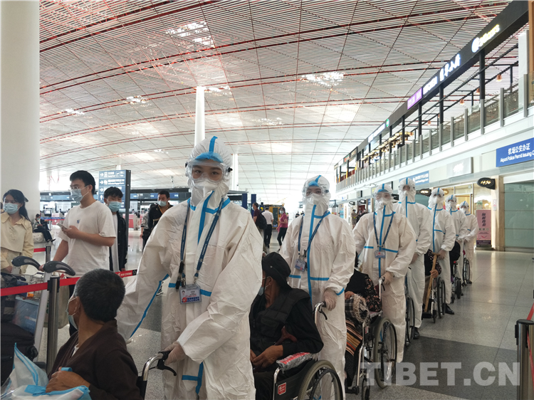 圖為首都機(jī)場工作人員周到有序的幫助患者推輪椅進(jìn)入候機(jī)廳