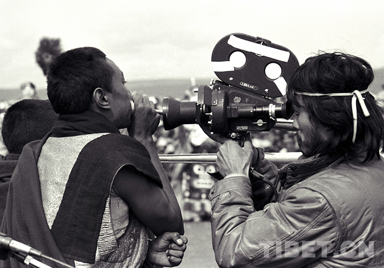 這是北京科學(xué)教育電影制片廠《萬(wàn)里藏北》攝制組在那曲賽馬會(huì)上拍攝吹長(zhǎng)號(hào)的僧人(唐召明1987年攝)