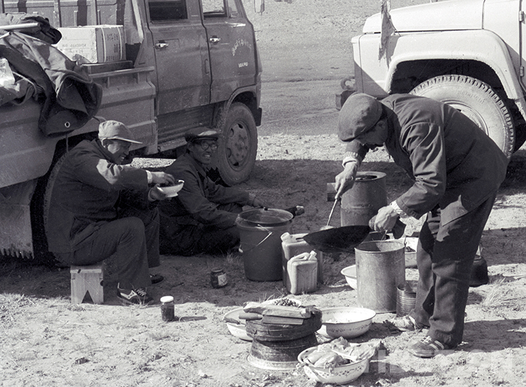 這是陜西省動(dòng)物研究所姚建初(左一)等動(dòng)物學(xué)家在科考中自己動(dòng)手起火做飯(唐召明1987年攝)