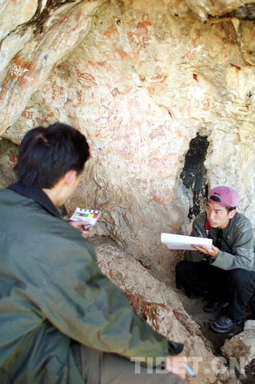 這是藏北無(wú)人區(qū)科考團(tuán)科考人員在對(duì)班戈縣洞窟巖畫(huà)進(jìn)行科學(xué)考察(唐召明2001年攝)