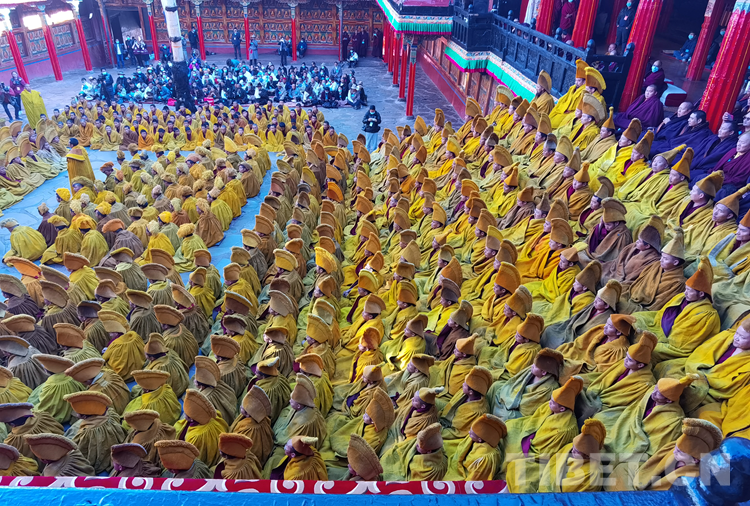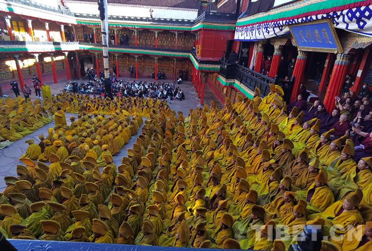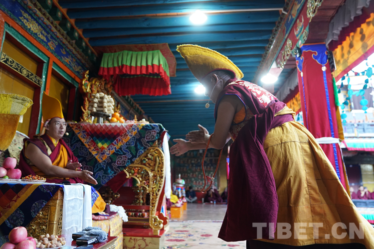 經過數日準備,26日下午,班禪于扎什倫布寺參加嘎欽學位立宗答辯。來自西藏自治區(qū)藏傳佛教各教派的堪布、經師等高僧以及扎什倫布寺僧眾、信教群眾等800人共赴盛會、共享法喜。