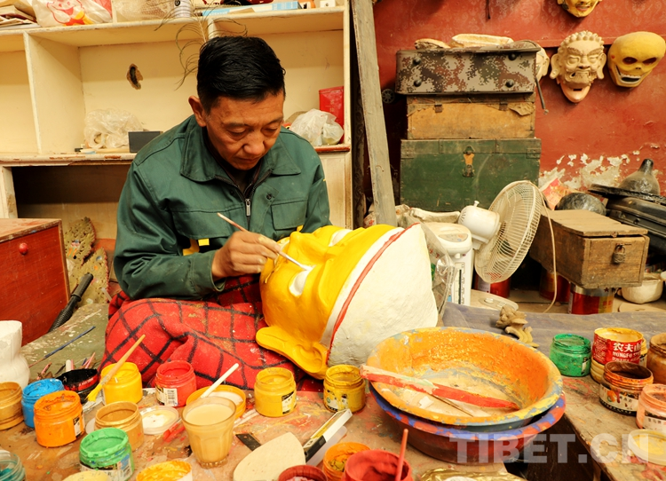 圖為一位工匠正在給藏式面具上色 攝影:賈華加