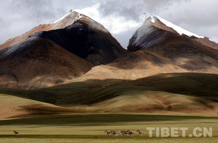 這是藏北刀劈式的雪山與山下奔跑的藏野驢(唐召明2009年攝)