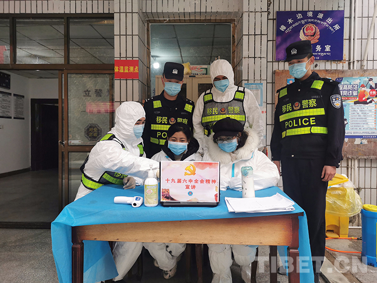 圖為樟木邊境派出所第三警務(wù)室執(zhí)勤民警與口岸醫(yī)院醫(yī)護(hù)人員共同學(xué)習(xí)十九屆六中全會精神