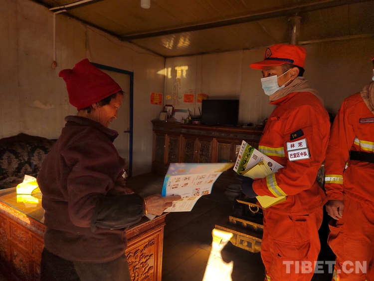 圖為巴宜區(qū)中隊(duì)指戰(zhàn)員入戶為駐地群眾普及防火知識(shí)