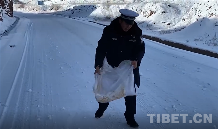 2018年3月,國(guó)道317突然遭遇了暴雪天氣,許多群眾和車輛被困在了矮拉山山頂,扎西四郎跟著隊(duì)友們?cè)诹阆氯喽鹊膼毫迎h(huán)境下堅(jiān)守了28天。令扎西四郎印象最深刻的是有一次,因?yàn)檐囎記]辦法通行,隊(duì)長(zhǎng)指揮民警帶群眾下山。當(dāng)時(shí),有一位要去拉薩的老奶奶腿腳不方便,她自己根本就沒辦法走動(dòng),扎西四郎就和桑珠一起輪流背著老人下山,雖然中間滑倒了幾次,可還是把老人背到了能通車的安全位置,老人為了表達(dá)感激,還專門給他們留下了拉薩的住址和聯(lián)系電話。