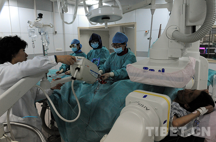 這是北京安貞醫(yī)院醫(yī)生顧虹(前右一)在北京安貞醫(yī)院為藏族婦女才塔爾實(shí)施心臟內(nèi)科介入手術(shù)(唐召明2013年4月2日攝)
