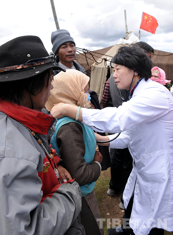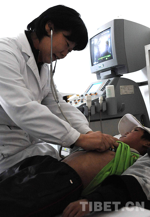 這是北京安貞醫(yī)院醫(yī)生顧虹在當(dāng)雄縣納木錯(cuò)鄉(xiāng)為牧民群眾進(jìn)行先天性心臟病篩查(唐召明2012年7月29日攝)