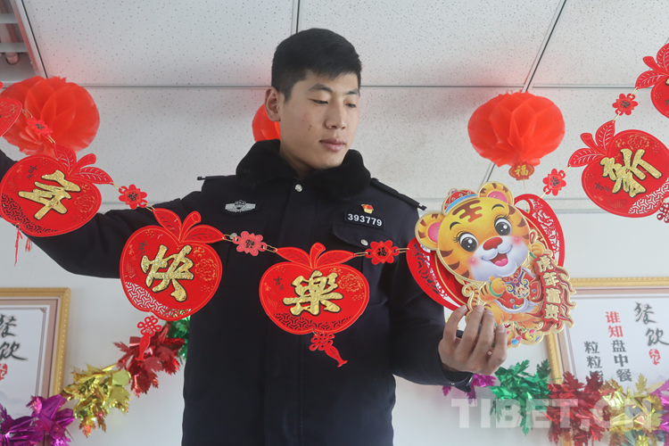 圖為日喀則邊境管理支隊昌果邊境派出所九年未回家過春節(jié)的民警郜曉占布置春節(jié)裝飾