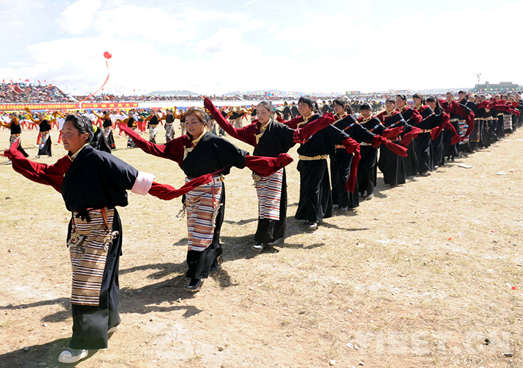 這是在藏北首府那曲鎮(zhèn)賽馬會上,牧民群眾所跳的大型“鍋莊”舞(唐召明2013年8月10日攝)