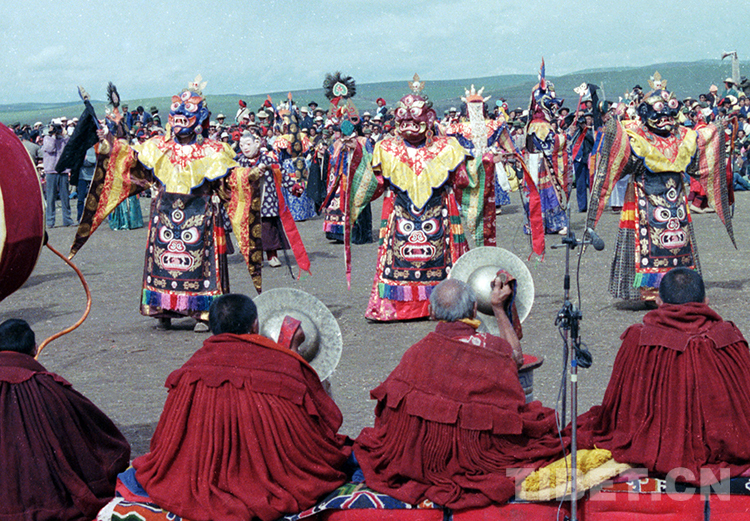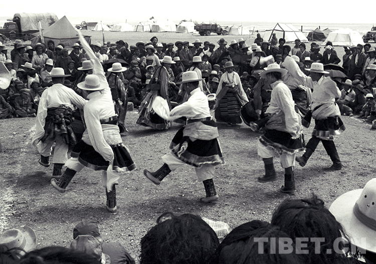 這是在藏北首府那曲鎮(zhèn)賽馬會上,僧人跳起的寺廟“鍋莊”舞(唐召明1987年攝)