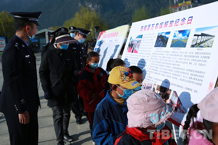 圖為觀看展板上關(guān)于“西藏百萬農(nóng)奴解放紀(jì)念日”的介紹