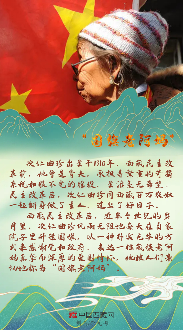 西藏民主改革后,次仁曲珍在自家院子里升起國(guó)旗,這一升就是近半個(gè)世紀(jì),一天不落,風(fēng)雨無阻。只有經(jīng)歷過舊西藏的人才知道新西藏的可貴,翻身成為國(guó)家主人的“國(guó)旗老阿媽”,以上萬天堅(jiān)持不渝的行動(dòng)表達(dá)著自己樸素的愛國(guó)情懷。