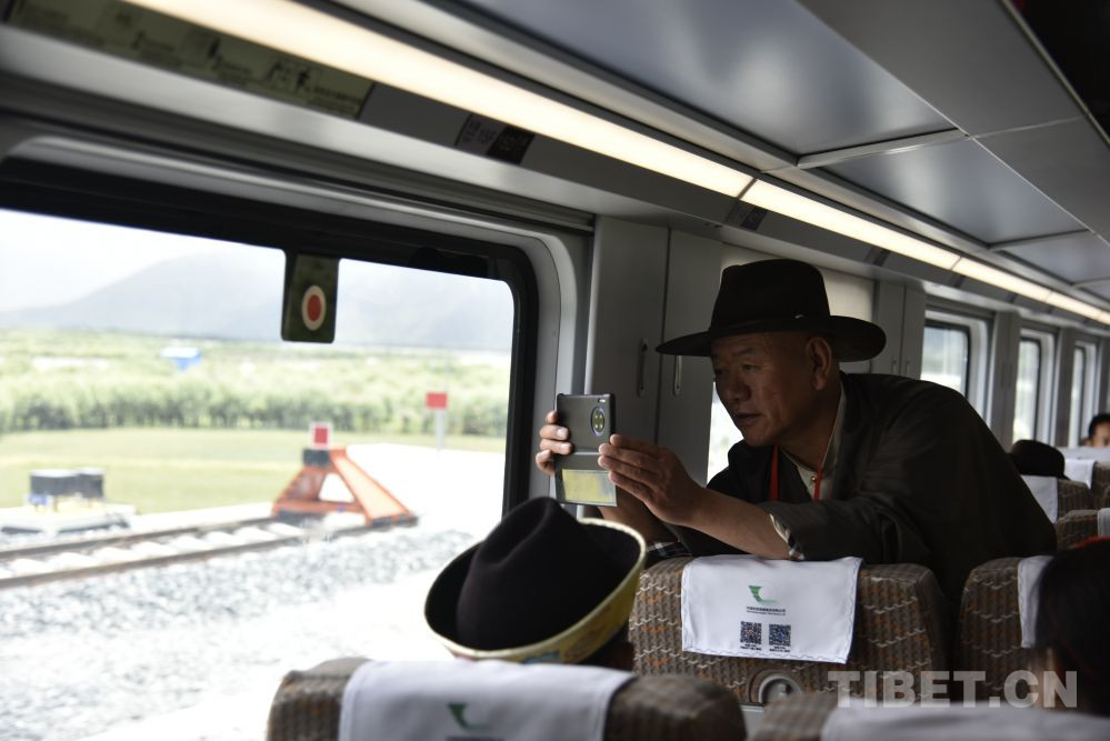 圖為2021年6月25日復(fù)興號(hào)高原雙源動(dòng)力集中動(dòng)車組即將抵達(dá)西藏林芝站,乘客拍照 攝影:王媛媛