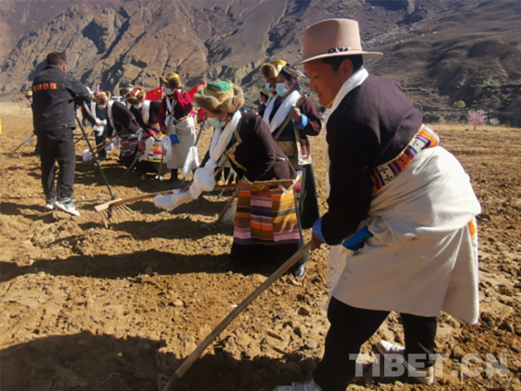 活動現(xiàn)場,群眾頭戴藏式金花帽,身著氆氌藏裝,或手持犁耙和鋤頭,或開著拖拉機,以吃切瑪、敬青稞酒、獻哈達、跳鍋莊、犁地、播種等傳統(tǒng)習(xí)俗,隆重慶祝共康村首屆開耕節(jié)。