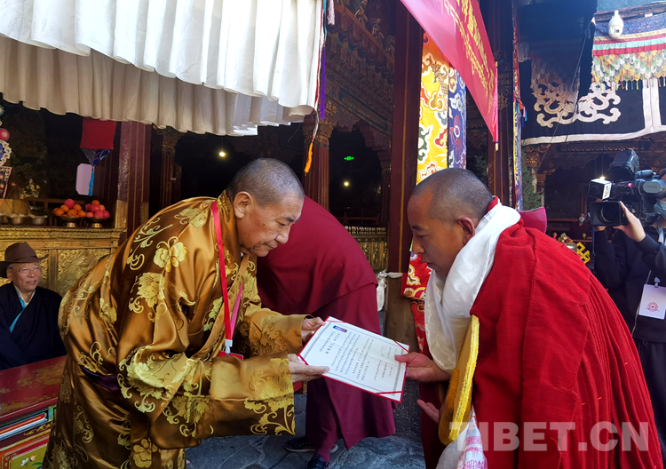 圖為中國佛教協(xié)會(huì)西藏分會(huì)常務(wù)副會(huì)長珠康·土登克珠活佛(左)向考僧頒發(fā)學(xué)位證書 攝影:王淑