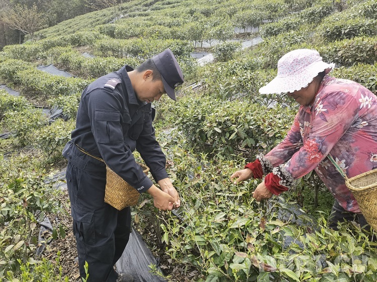 “純手工采茶采摘芽葉比較均勻,茶葉的品質(zhì)也比較好,這也導(dǎo)致需要大量人力手工采摘,每年我們派出所都會通過開展‘助農(nóng)春耕’活動,幫助轄區(qū)人手不足的農(nóng)戶采摘茶葉?!北潮肋吘撑沙鏊窬钪艺f。