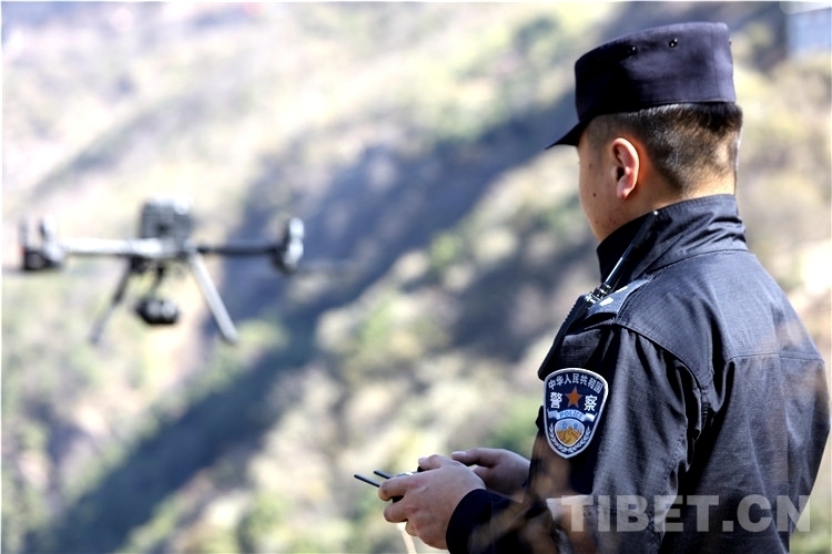圖為民警利用無人機(jī)對(duì)波曲河道兩翼滑坡地段進(jìn)行勘測 攝影:鄒興國