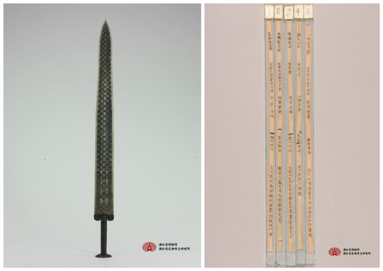 圖為湖北省博物館的兩件鎮(zhèn)館之寶:左為歷經2500余年依然寒光閃閃、毫無銹蝕的“天下第一劍”——越王勾踐劍,右為云夢睡虎地秦簡 圖片來源:湖北省博物館網站