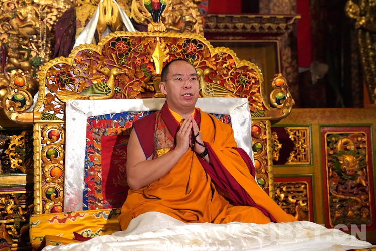 圖為班禪在釋迦牟尼佛像前帶領(lǐng)眾僧誦經(jīng)祈愿 攝影:王淑