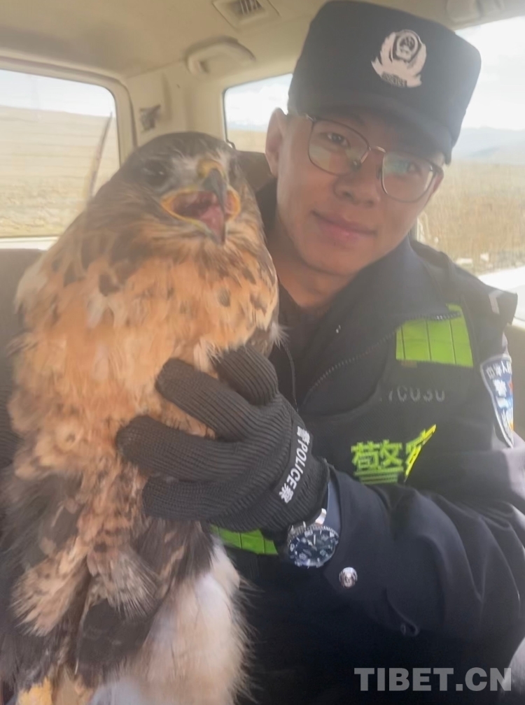 圖為民警與被救助的金雕幼鳥 攝影:旦增多吉