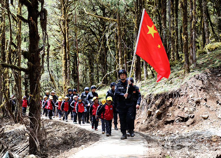 圖為玉麥邊境派出所組織單位民警、轄區(qū)黨員干部、群眾代表和全體學生共走巡邊路 張浩帥攝
