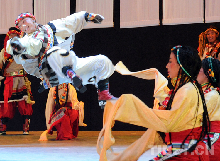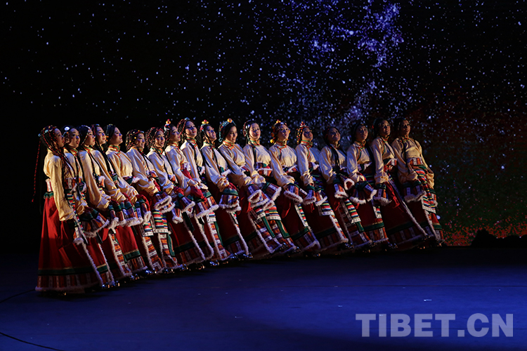 這是班戈縣諧欽民間藝術(shù)團(tuán)的年輕舞蹈演員在北京國(guó)家大劇院演出時(shí)的劇照(唐召明2015年10月13日攝)